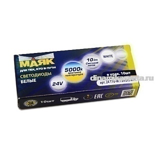 Автолампа LED МАЯК 24-T10/1SMD W5W(T10) 24V W2,1x9,5d White (БЕЛЫЙ,5050/1) (К10/500)